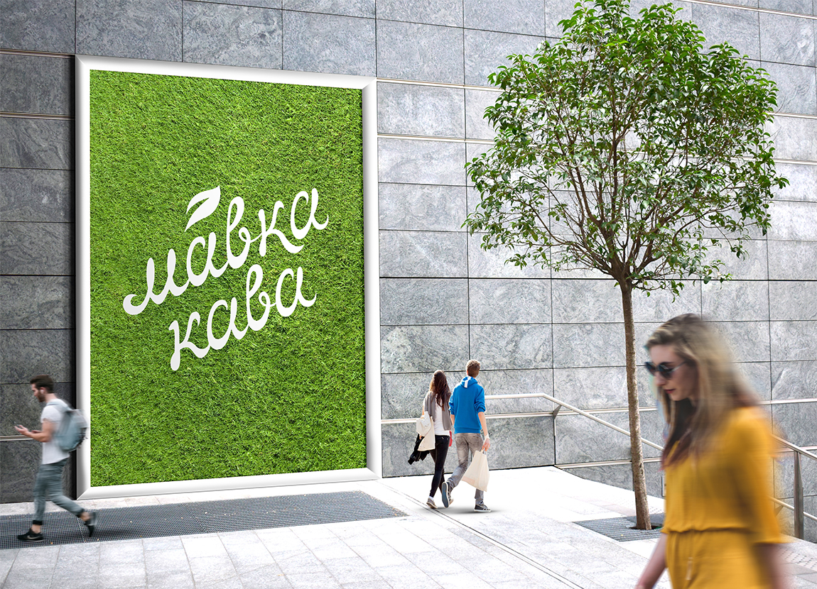 Рішення: Розроблений з нуля леттерінг, у який органічно впроваджено елемент зелені, - уособлює особливість кав'ярні. Унікальність леттерінгу підкреслює особливий характер і привертає увагу.